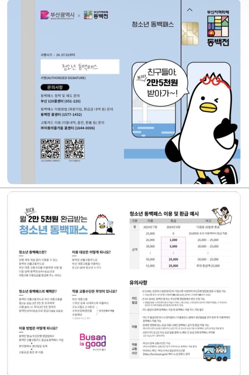 현행 동백패스는 만 19세 이상 성인을 대상으로 부산에 등록된 시내버스 와 마을버스, 도시철도, 경전철, 동해선을 월 4만 5천 원 이상 이용하면 월 9만 원까지 초과 사용액(최대 4만 5천 원)을 동백전으로 환급해 주고 있는데요. 청소년 동백패스는 성인보다 낮은 청소년 대중교통 요금을 감안해 월 2만 5천 원 이상 이용하면 월 5만 원까지 초과 사용액(최대 2만5천 원)을 동백 전으로 환급해 줍니다.