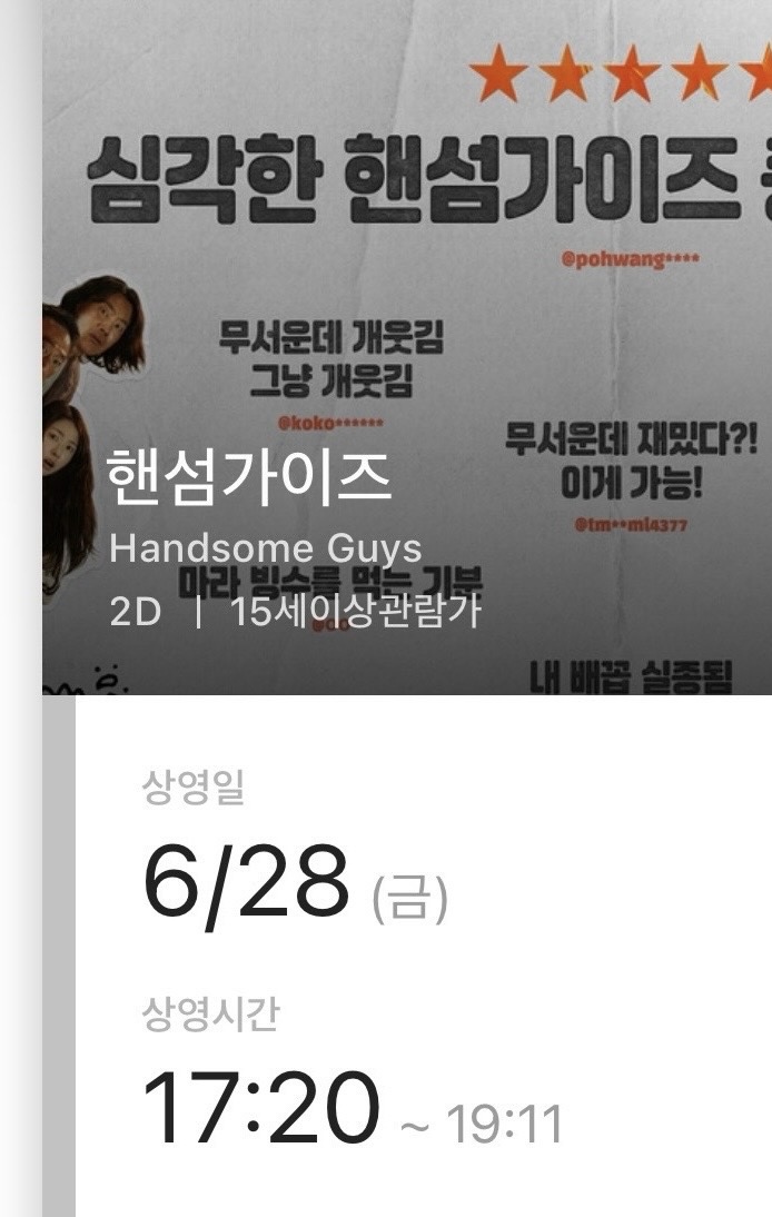 평점이 높아서 보려고했던 건 얼마전 상영관들에서 내려갔고, 선택지가 세개 있었는데 하나는 제 취향 장르가 아예 아니고 하나는 리뷰가 처참해서 결국 이 핸섬가이즈를 선택하게 됐습니다.
