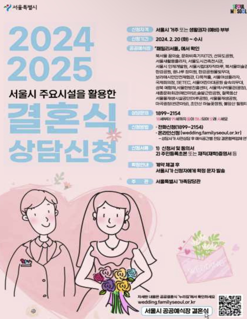 서울시 주요시설을 활용한 결혼식 상담전화 1899-2154 | E-mail familyseoul.wedding@gmail.com Copyright © 2024. Seoul Metropolitan Government. All rights reserved.