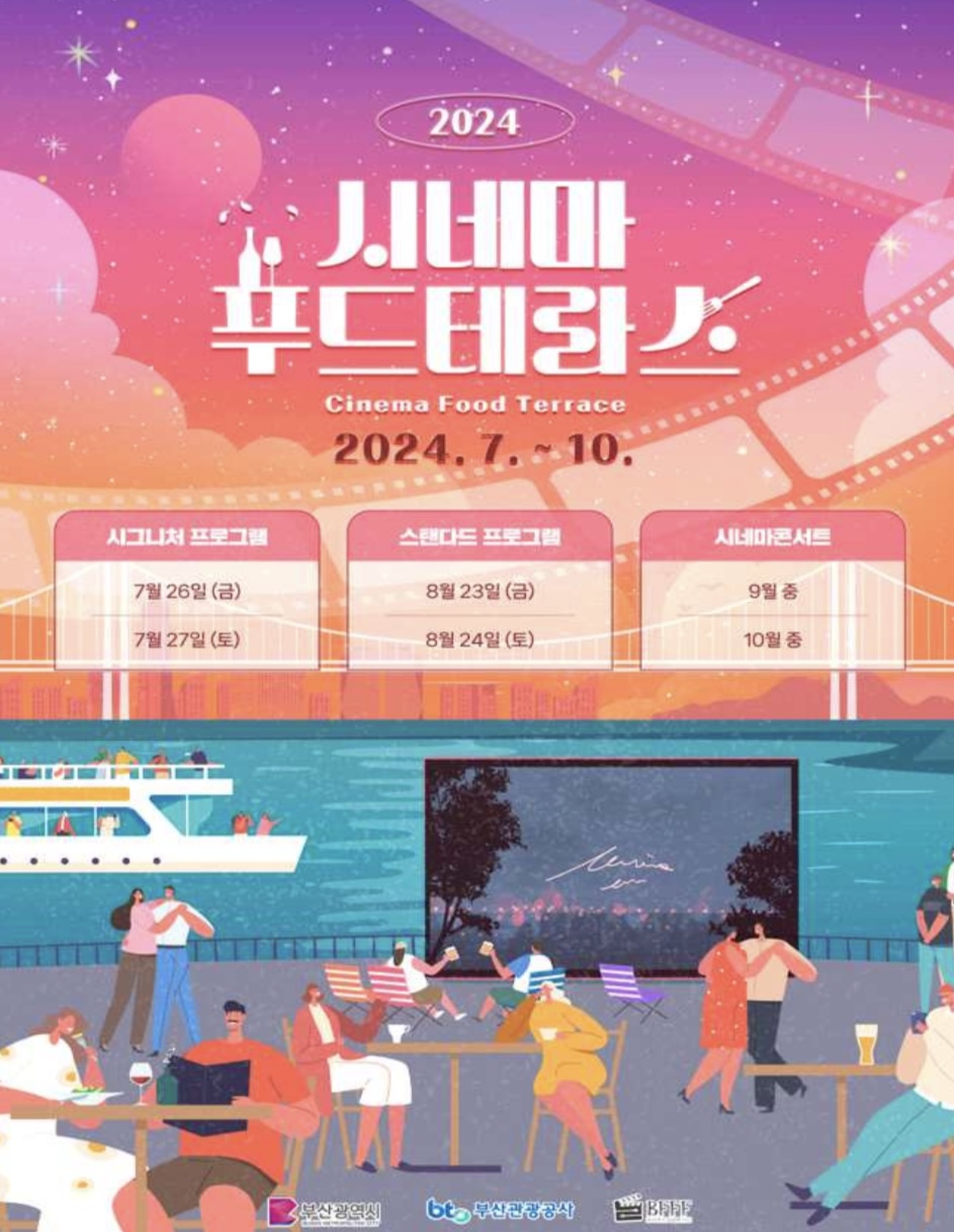 부산시와 부산관광공사는 7월부터 10월까지 미식이 함께하는 영화 이벤트 시네마 푸드테라스를 총 6회 운영한다고 밝혔습니다. 국제관광도시 육성사업의 일환인 이 사업은 영화도시 부산을 알리고 영화 와 연계한 관광상품을 개발하기 위해 부산푸드필름페스타와 협업해 추진되는데요. 지난 6월 영화의 전당에서 ‘2024년 푸드필름페스타’와 함께 2차례 진행됐습니다.