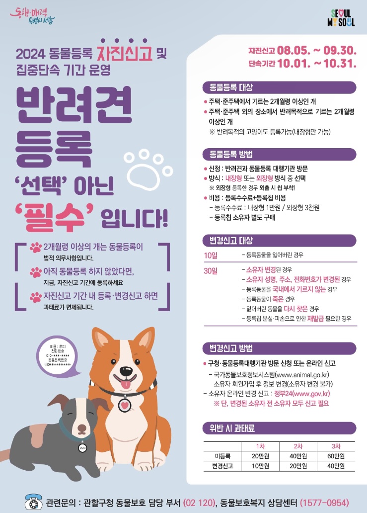 사랑하는 가족인 반려견의 보호와 유실, 유기 방지를 위해 동물등록은 선택이 아닌 필수입니다.서울시는 시민들의 동물 등록을 강화하기 위해 8.5.~9.30까지 ‘동물등록 자진신고 기간’을 운영하고, 신규로 동물 등록 을 하거나 기존 등록 정보 중 변경 사항을 신고해도 ‘미등록,미신고 과태료’를 면제한다고 밝혔습니다.