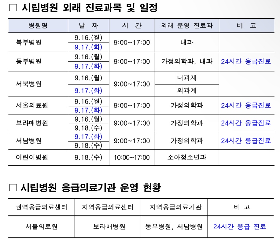 시립병원 7곳 중 서울의료원과 동부,보라매,서남병원은 24시간 응급실을 운영합니다. 서울의료원과 북부,동부,서북,서남병원은 추석 당일 운영하며, 그 외 병원도 16일(월)부터 18일(수)까지 내과, 가정의학과 등 외래진료를 합니다.