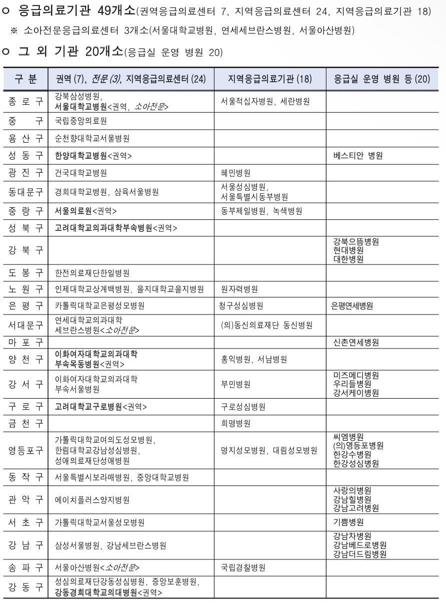 서울시 내 응급의료기관과 종합병원 응급실은 추석 연휴에도 평소와 같이 24시간 운영합니다. 서울대학교병원 등 권역,지역응급의료센터 31개소, 서울시 서남병원 등 지역응급의료기관 18개소, 응급실 운영병원 20개소로 총 69개 응급의료기관이 가동됩니다.