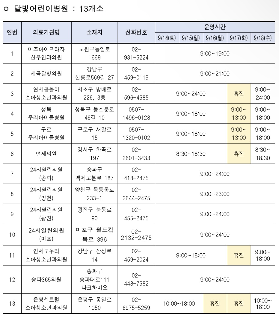 서울 추석연휴 문 여는 병원 약국 소아과 보건소 목록
