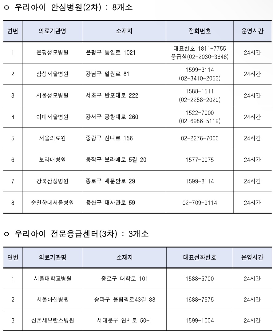 소아 환자가 응급실을 찾지 못하는 상황을 방지하기 위해 ‘우리아이안심병원’ 8개소(준응급환자), ‘우리아이 전문응급센터’ 3개소(중증응급환자)가 24시간 운영됩니다. 또한 소아 경증 환자의 외래진료를 위해 ‘달빛어린이병원’ 13개소도 운영됩니다.
