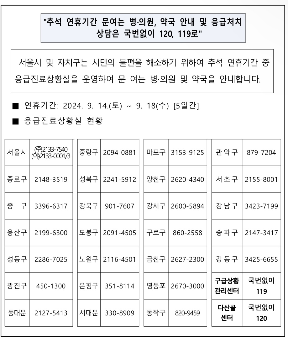 한편 서울시는 공공의료 가동에 총력을 다합니다. 25개 자치구의 모든 보건소가 추석 당일에 정상 진료하며, 추석 전후 4일은 권역별 인력의 1/2씩 비상진료반을 운영할 예정입니다.
