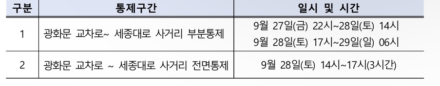 광화문 세종대로 9월27일 28일 29일 교통통제 구간 시간 안내