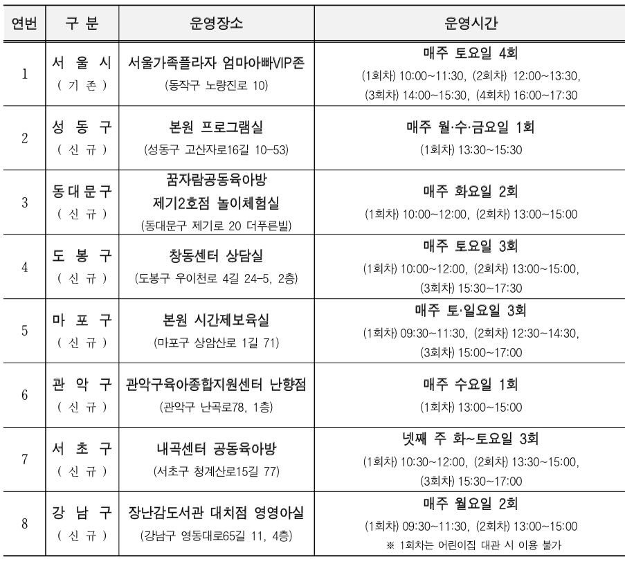 서울아이백일돌컷 을 이용할 수 있는 곳은 8곳입니다. 서울시는 앞서 지난 6월부터 대방역 인근 서울가족플라자(동작구 노량진로 10) 내 서울엄마아빠VIP존에서 시범운영을 시작했으며, 이용자들의 높은 만족도와 먼거리 이동에 따른 부담 등을 고려해서 이번에 7개 자치구 육아종합지원센터(성동 동대문 도봉 마포 관악 서초 강남)로 확대했습니다.