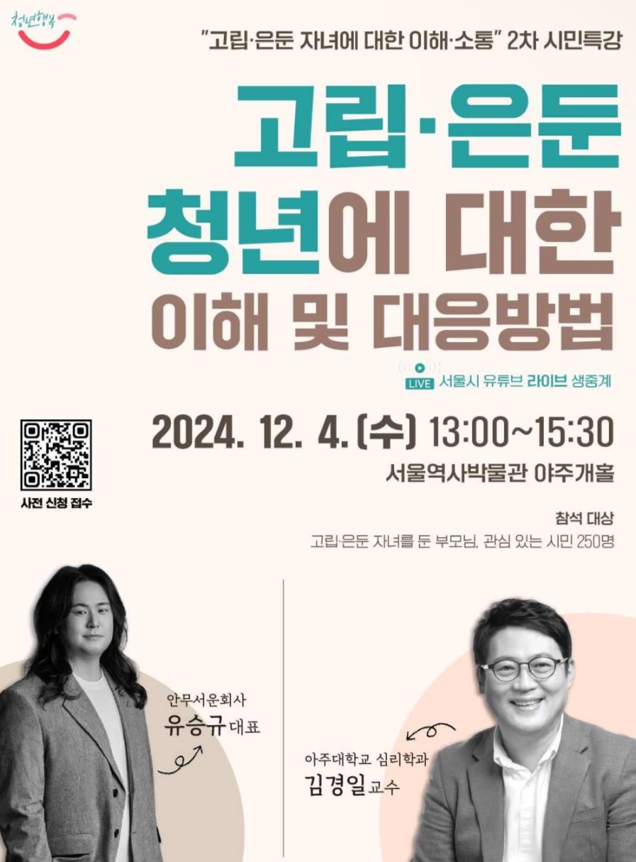 서울시는 고립·은둔 자녀를 둔 부모님과 관심 있는 시민을 대상으로 김경일 강사(아주대 심리학과 교수)와 유승규 강사(안무서운회사 대표)을 모시고 특강을 무료로 실시합니다. 관심 있는 시