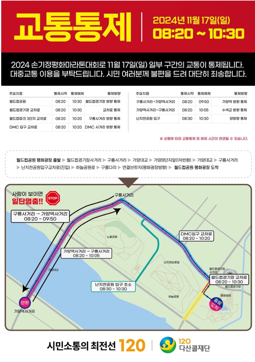 대회 당일 17일(일) 오전 8시 20분부터 오전 10시 30분까지는 안전한 대회 운영을 위해 월드컵경기장 사거리, 구룡사거리, 가양대교등 마라톤 주요 구간의 단계별 교통통제가 이뤄질 예정입니다. 교통통제 시간과 우회 구간 등의 자세한 정보는 120 다산콜센터(국번 없이 120)에 문의하거나 아래 통제 안내 지도를 참고하면 됩니다.