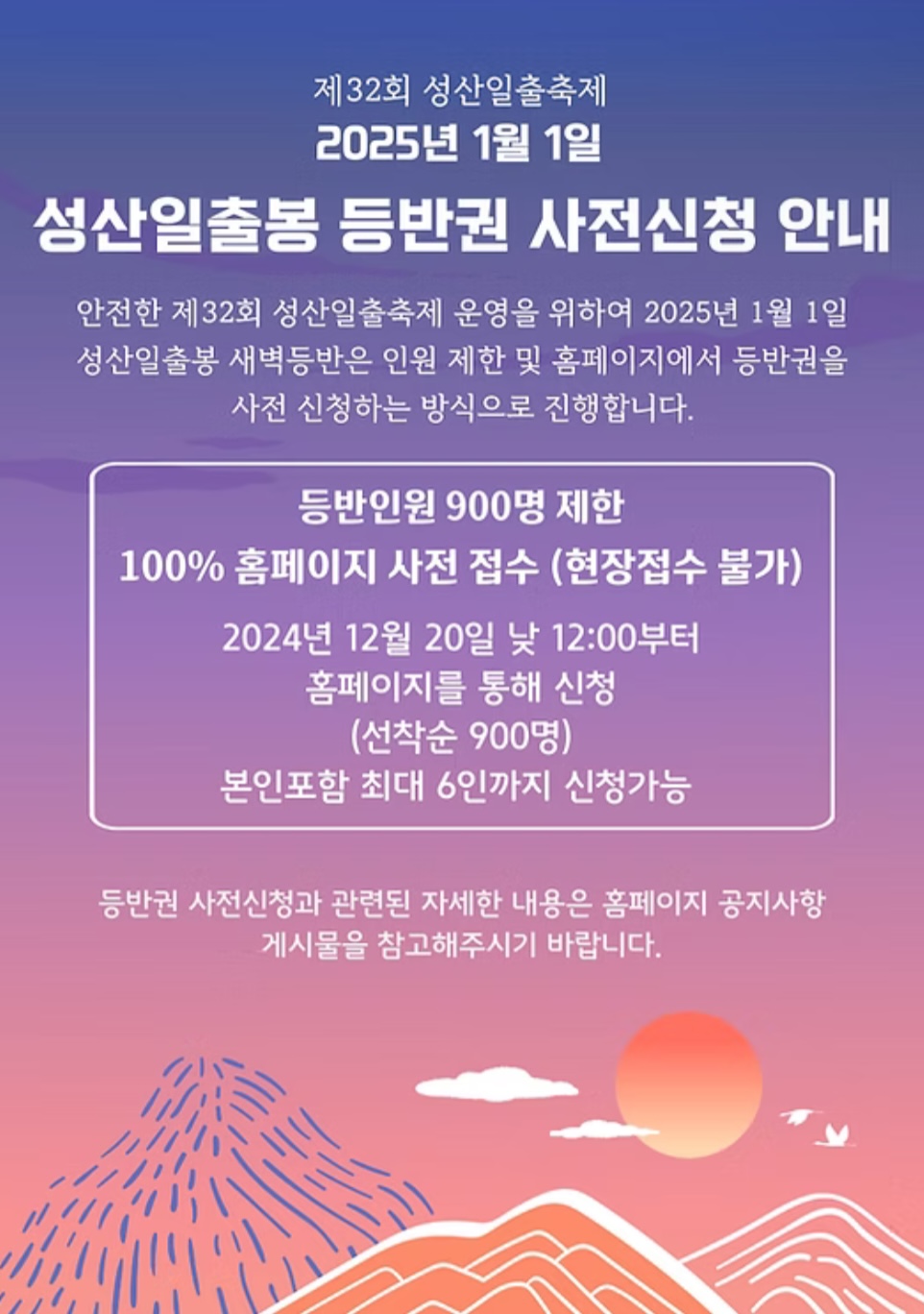 작년과 같이 등반인원은 총 900명이며 2024년12월20일 수요일 낮12시부터 예약신청할수 있습니다. 본인포함6명까지 가능합니다. 온라인 예약하지못하면 현장에서는 접수가 절대 안됩니다. 선착순 마감이라서 피켓팅이 예상됩니다. 과연 쉽게 할수있을지 모르겠습니다.