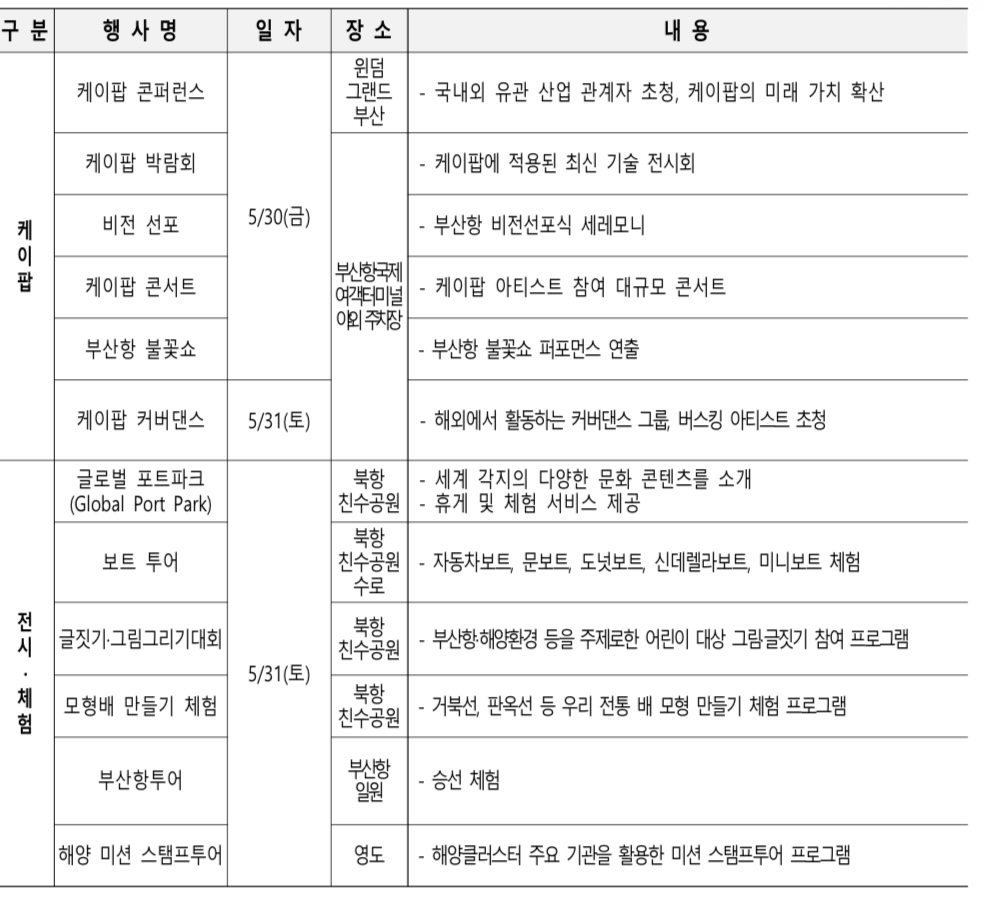 이어서 개막일의 화려한 피날레로 펼쳐질 부산항 불꽃쇼는 아름다운 야경과 어우러져 관람객들에게 잊지 못할 추억을 선사할 예정입니다. 축제 둘째 날인 5월 31일에는 북항 친수공원 일원에서 진행되며 영도 국립해양박물관 일원에서는 미션 스탬프 투어 프로그램 등 각종 시민참여 프로그램이 진행된다.
