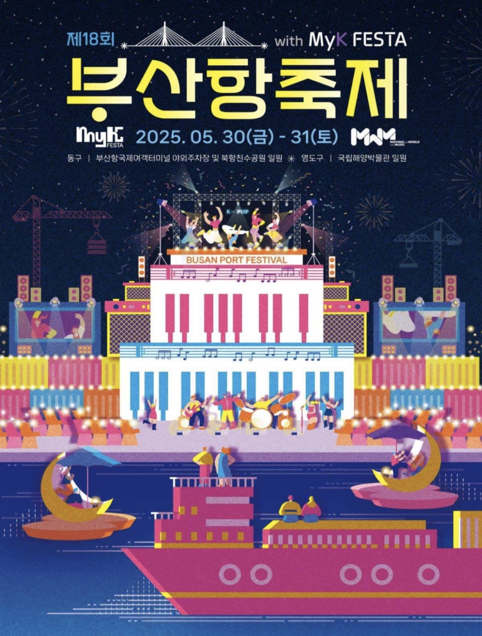 올해로 행사 18회째이며 부산항 국제여객터미널,북항 친수공원,영도 국립해양박물관 일원에서 개최됩니다. 올해 축제는 문화체육관광부가 주관하는 대형 한류종합행사 지자체 연계 공모사업 선정 마이케이 페스타(MyK FESTA)와 연계한 케이팝 프로그램이 추가되어 예년과는 완전히 달라진 모습을 선보일 (K-POP)예정입니다.