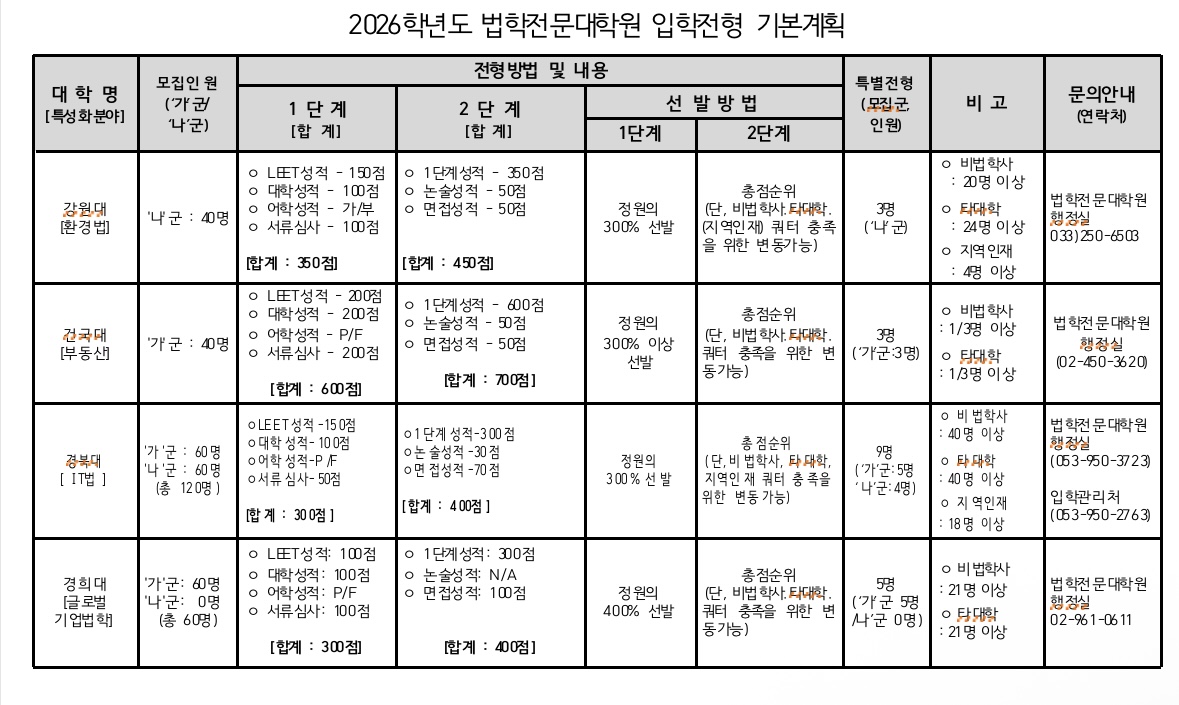법학전문대학협의회가 2026학년 로스쿨 입학전형 기본계획을 지난4월에 발표했습니다. 각 로스쿨 세세한 모집요강은 6월경 발표되지만 어느정도는 알고있는것도 좋을것입니다.