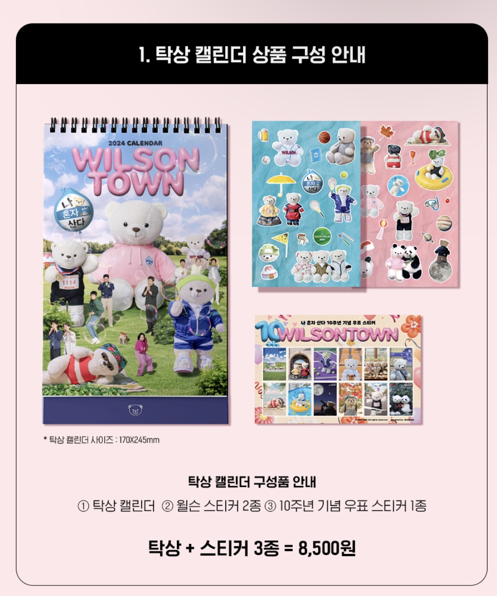 2013년부터 굳이 ott로 보면서 본방시간 칼각사수해왔던 나혼산에 미쳐있는사람입니다. 그럼에도 불구하고 캘린더는 2018년꺼 한번 샀었는데요. 이번 2024꺼는 윌슨 위주로 되어있길래 너무 심하게 구매욕구가 상승해서 글까지 쓰게 되었습니다. 사실 저 비슷한 인형도 사고싶지만 등짝맞을 것 같아서 자제하고있는 중이랍니다. 인형이 클수록 더 아프게 맞음..
