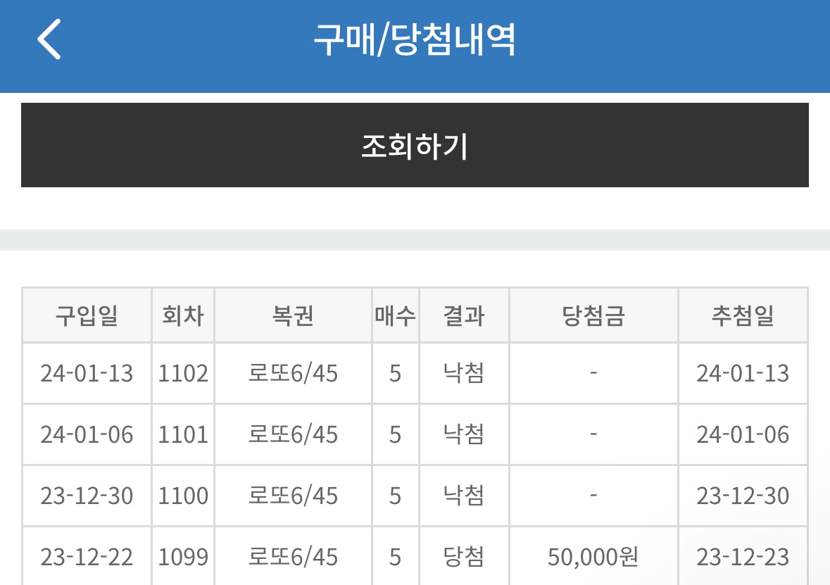 지금까지 세 번 4등이 되었습니다. 저는 개인적으로 pc로 사고있는데요. 5천원밖에 사지 못하는게 단점이지만 강제로 절제할수 있습니다. 가끔은 이렇게 4등에도 당첨됩니다. 자동으로 예치금에 넣어줍니다.
