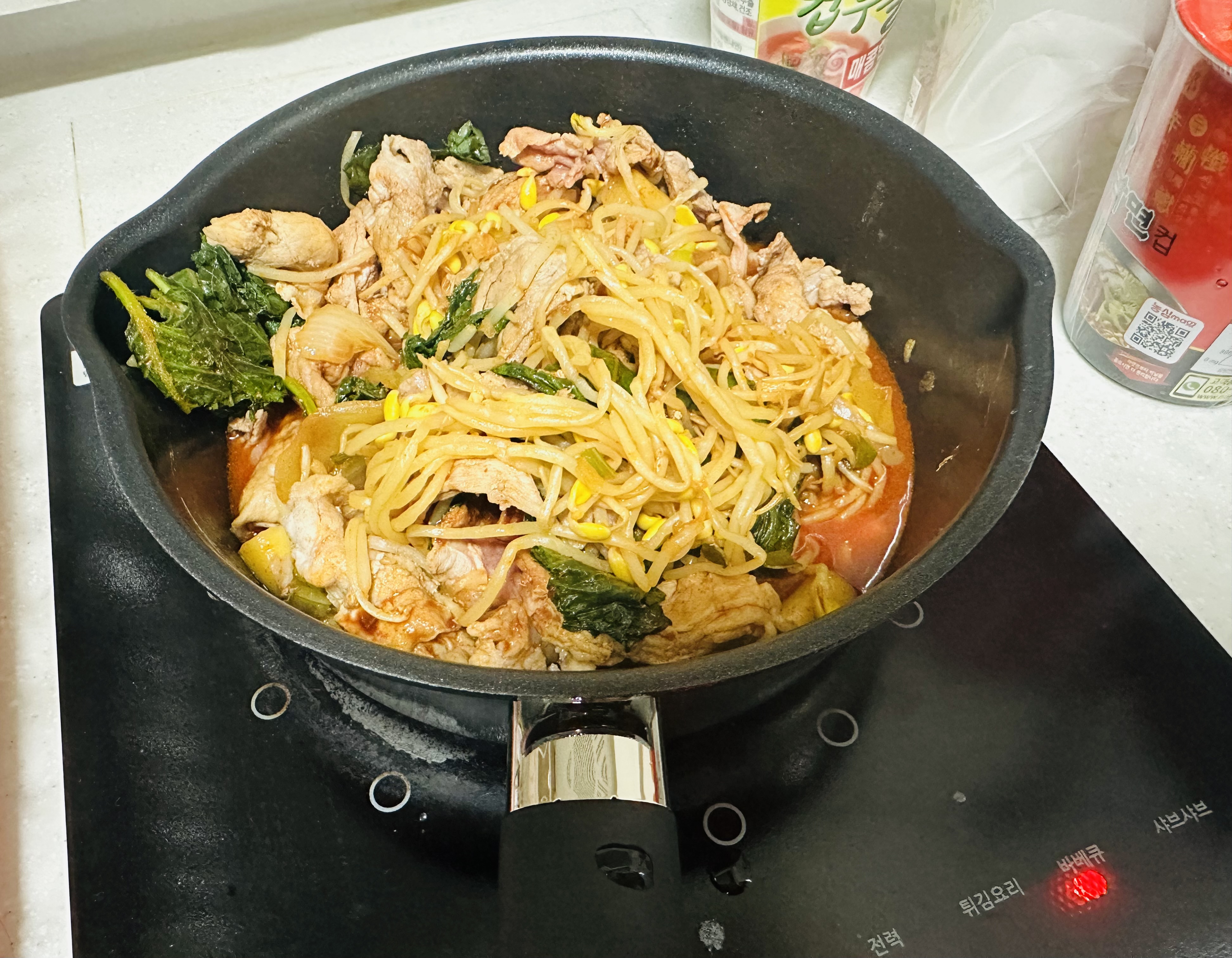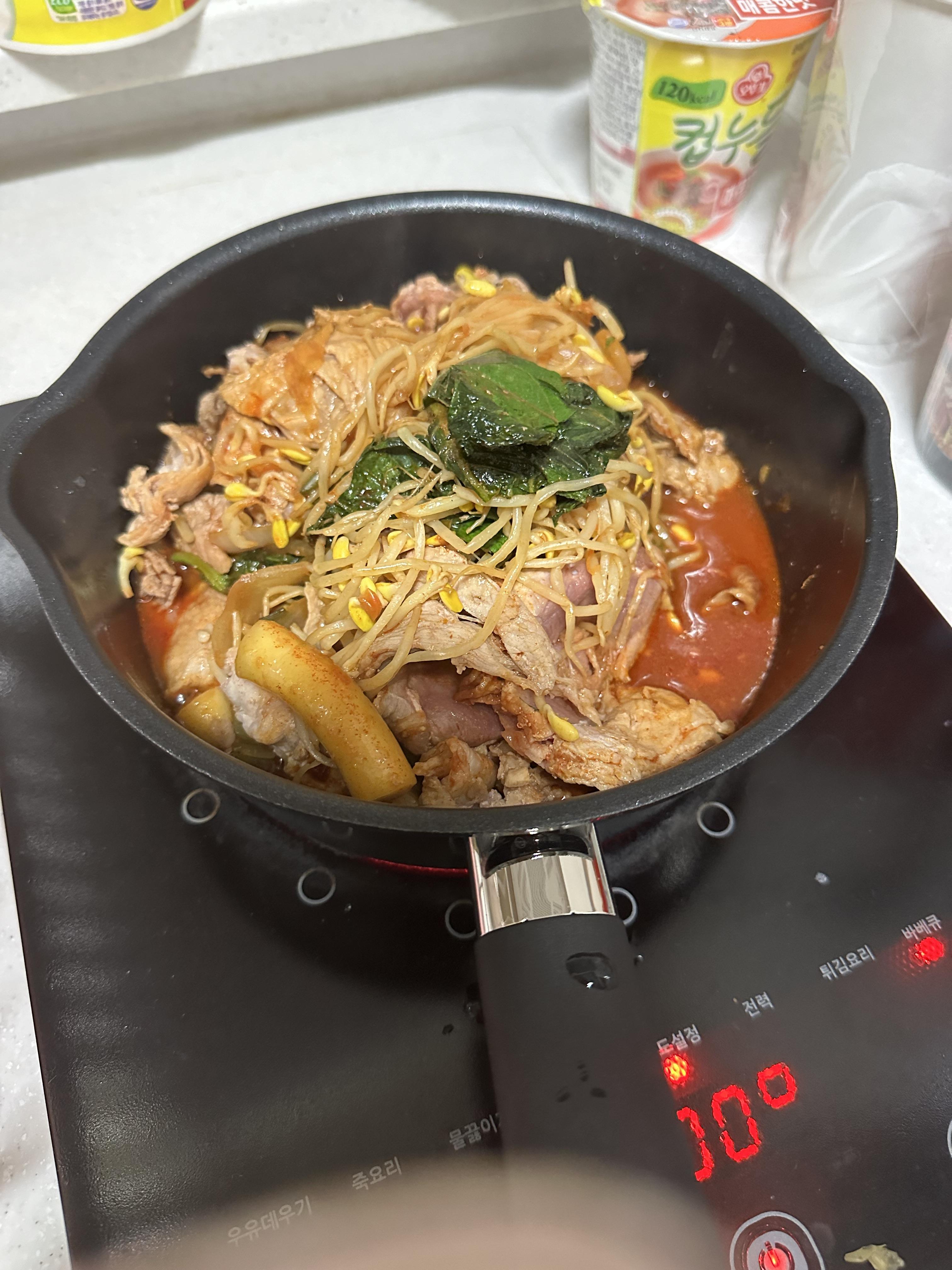 5.중불에 뒀다가 콩나물에서 물이 나오면 고기 안익은 부분을 아래로 가게 해주고 양념이랑 섞어주면 끝