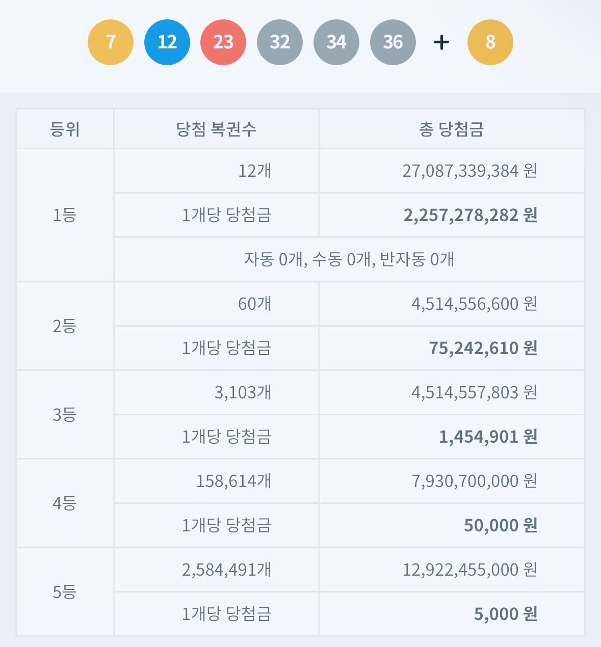 1등 당첨자는 번호6개 일치한 분들입니다. 12명, 한 사람당 세전 22억 5천만원정도이네요.