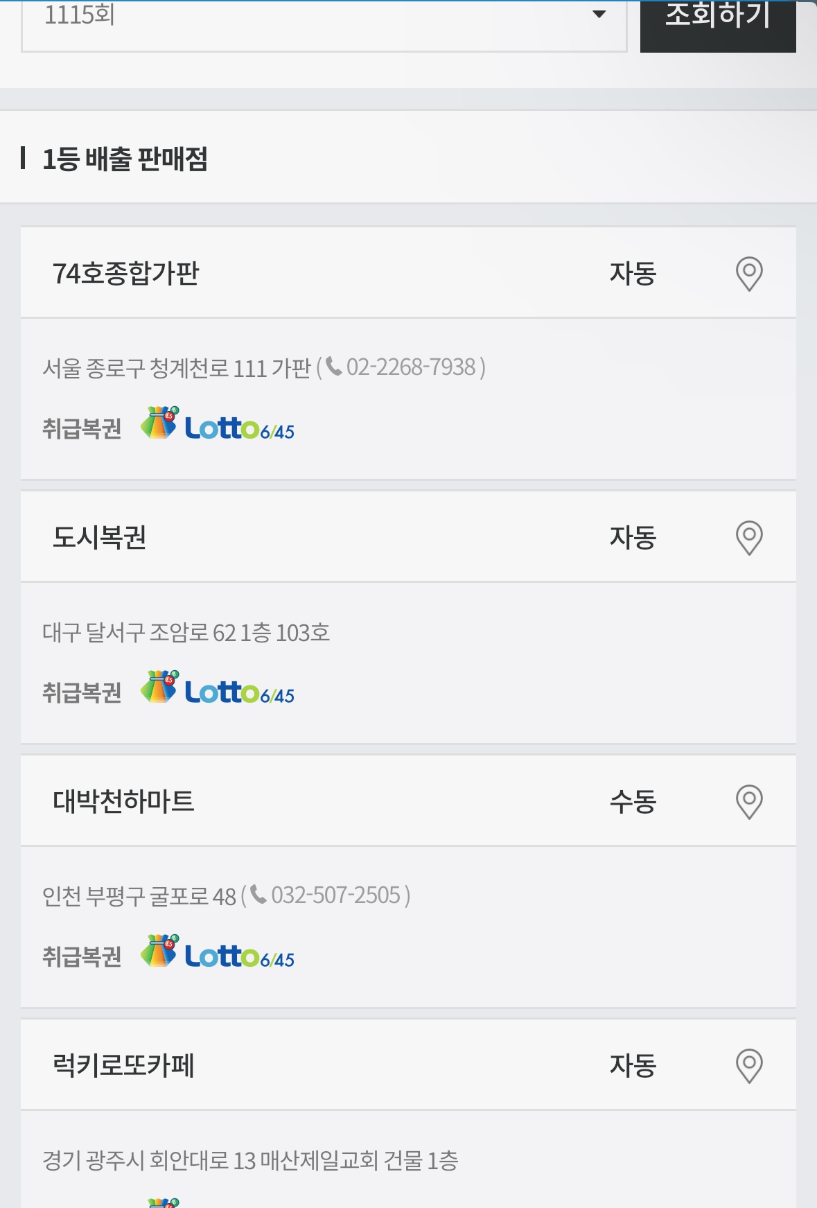 1115회 로또 당첨번호 1등 당첨판매점 당첨지역