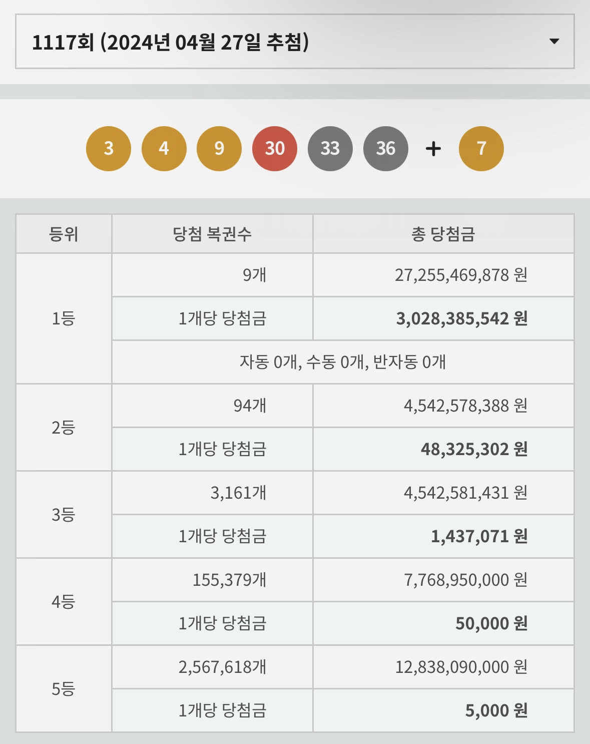 로또 1117회 당첨번호는 위와 같습니다.3,4,9,30,33,36 이고 보너스번호가 7입니다.