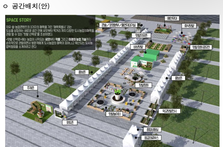 | 전 시 | •도시농업주제•홍보관, 포토존 운영 •다양한 텃밭모델 전시(텃밭놀이터, 텃밭정원, 상상텃밭, 휴식텃밭 등) °서울농업기술센터, 원예특작과학원, 11개 자치구, 도시농업단체 부스 •나만의 텃밭정원 공모전, 학교텃밭 전시 |