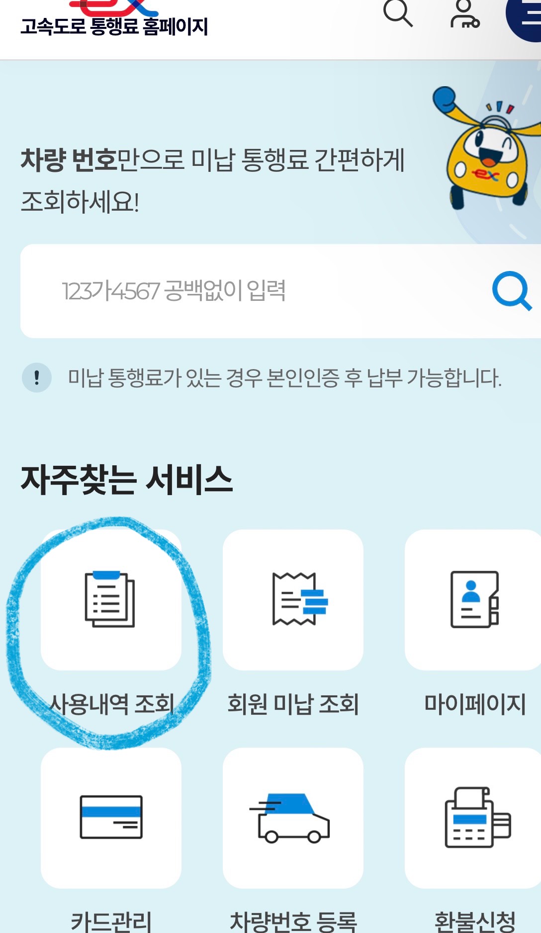 역시 고속도로 통행료 홈페이지 메인화면에 보시면 중간쯤에 검색창이 마련되어 있고 자주 찾는 서비스도 있어요.