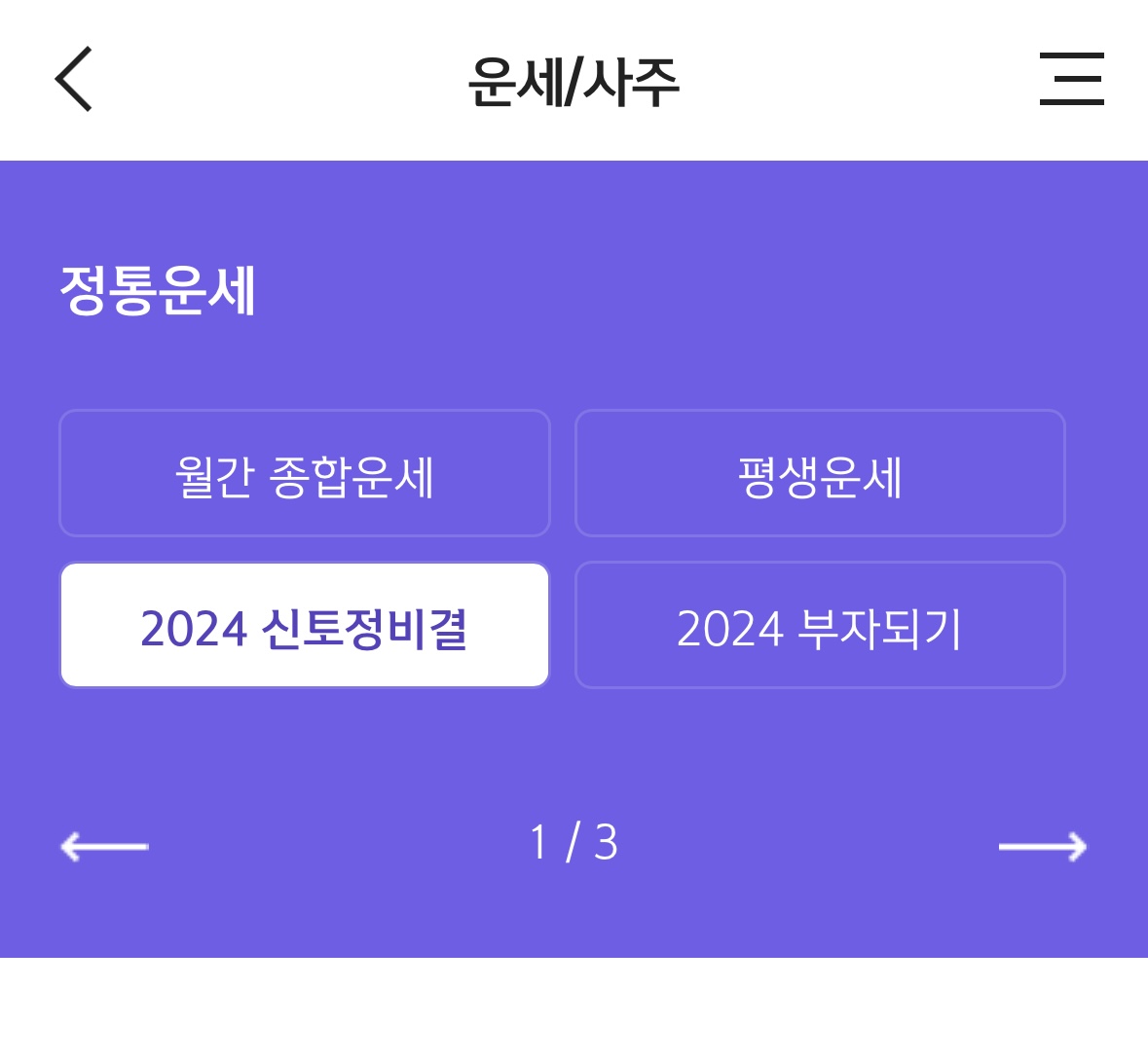 2024 운세가 드디어 업데이트 되었습니다. 저도 바로 이용을 해보았는데요. 총론, 재물운, 직장사업운, 가정건강운, 이성대인관계, 월별 세운까지 다채롭게 확인할 수 있습니다.