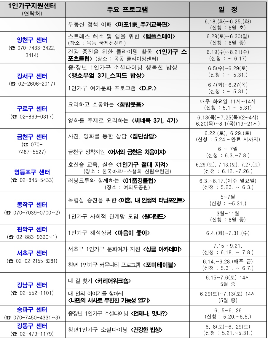 서울시 1인가구는 38.2%이며 156만입니다. 자치구별로 1인가구지원센터를 통해 6월 한달간 216개 프로그램(6월 기준)을 운영한다고합니다. 5천여 명이 참여할 예정이며 모두 무료입니다.