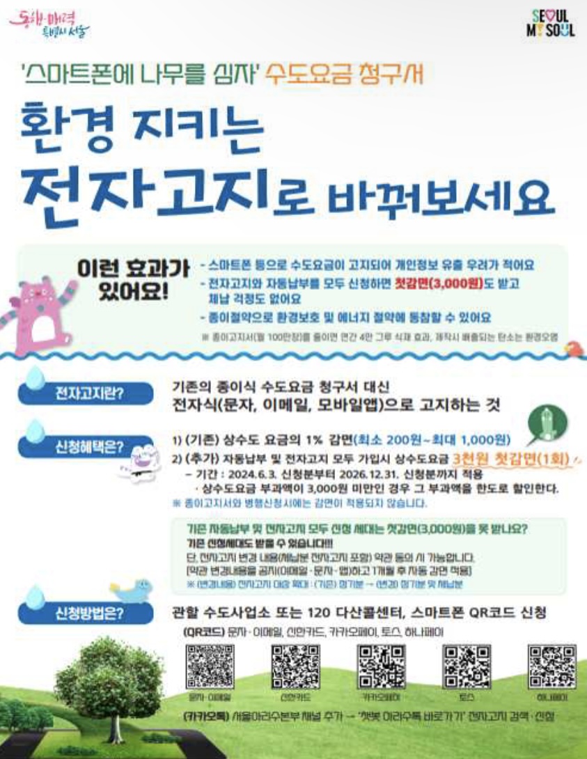 서울시는 6.3일부터 수도요금 청구를 전자고지와 자동납부를 모두 신청하면 3천 원 감면을 1회 시행합니다. 기존에 전자고지와 자동납부 서비스를 하고 계셨던 분들도 변경약관 동의 시 감면 혜택을 똑같이 받을 수 있습니다.
