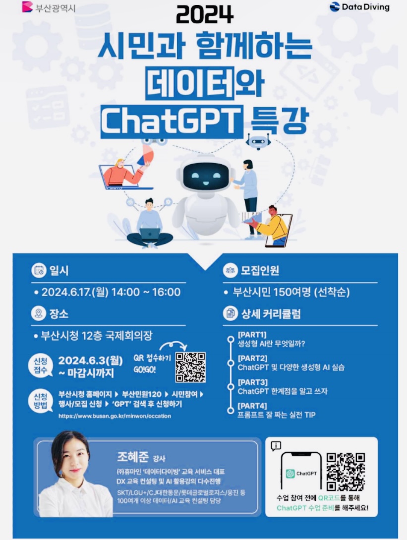 부산에는 다양하게 참여할 수 있는 행사가 많아보입니다. 챗지피티 관련해서 더 알고싶으신 분들이 계시다면 한번 신청해보시기 바랍니다.
